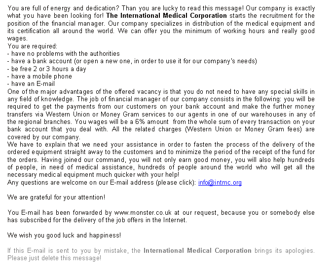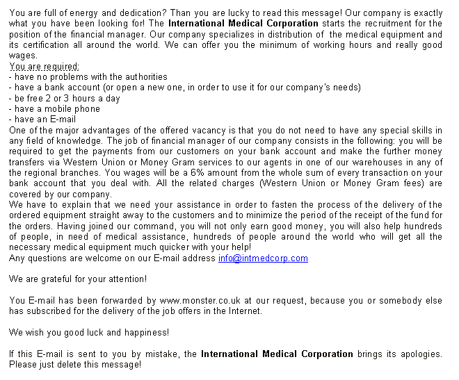Job offer spam: intmedcorp.comOther job offer scams: