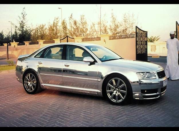A series of pictures making the rounds in a chain mail that shows off the wealth of the ruler of Abu Dabi in the United Arab Emirates (UAE). The final pictures show a silver Audi A8 limousine, which the author claims is made out of silver.